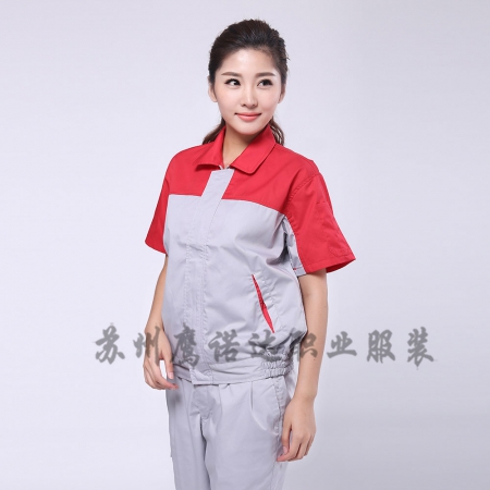 苏州鹰诺服装:深蓝配桔红短袖工作服AD069
