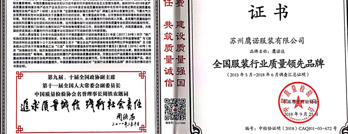 【喜报】鹰诺达荣获全国服装行业质量领先品牌